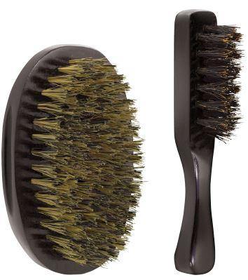 These 100% boar bristle brushes are perfect for maintaining a well groomed beard. Features a 4", 9 row oval palm brush, and a 4-1/2", 3 row brush for more intricate areas. Both feature black wooden handles with a high gloss finish.