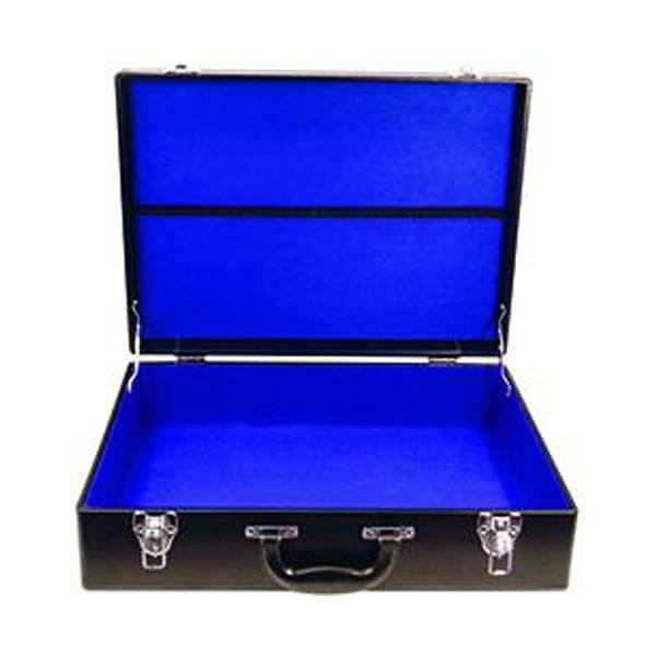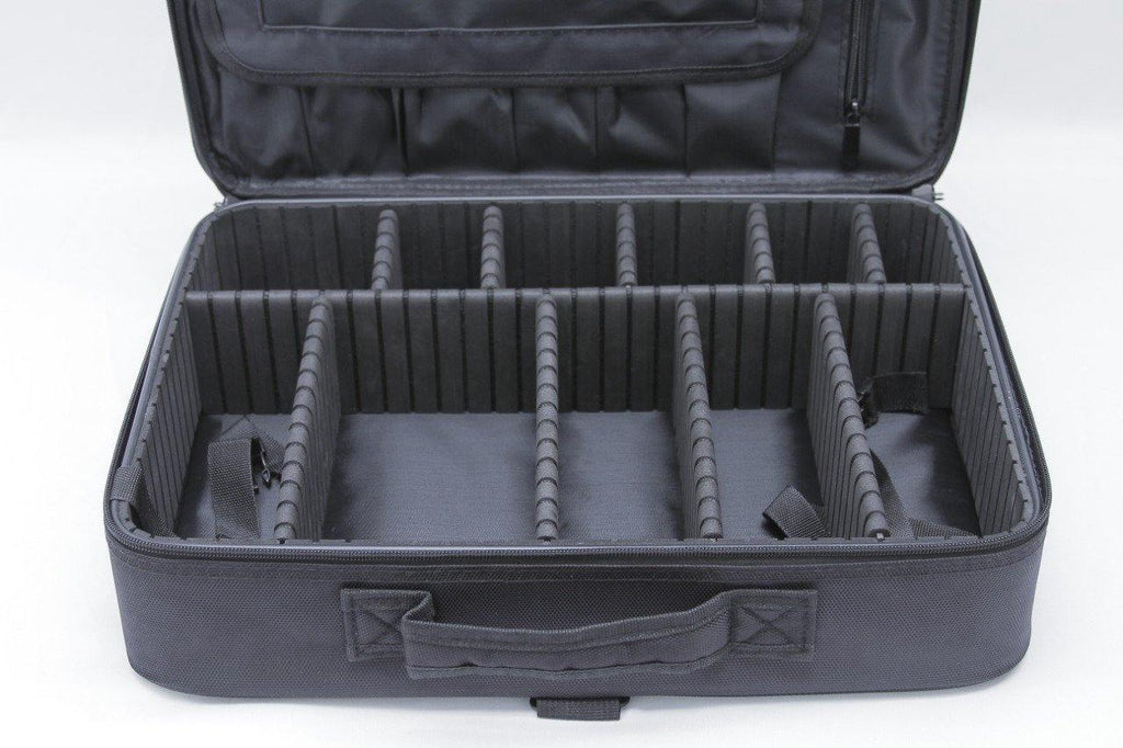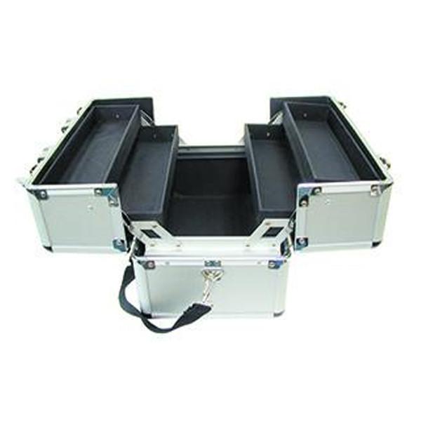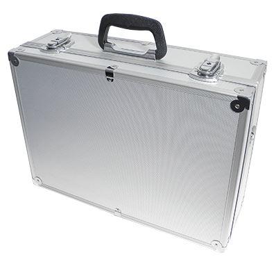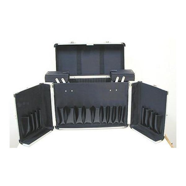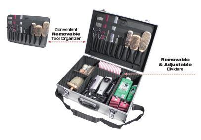 Lockable aluminum case features a main storage compartment with 5 adjustable dividers and an inside lid with removable tool organizer, 14 elastic loop holders and 11 pockets. Includes shoulder strap and carry handle. Textured silver finish. Measures 13"H x 17-3/4"W x 6"D.