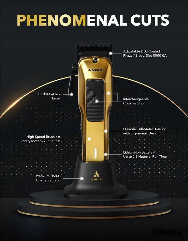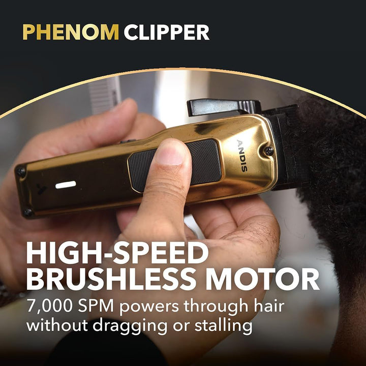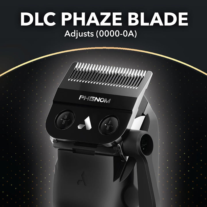 The Phenom Clipper lives up to its namesake with every cut you make. Featuring a new brushless rotary motor, this clipper delivers high-speed power for precision work at 7,000 SPM. Express true personalization with special interchangeable all-metal cover and textured grip colorways for four different combinations. Further customize your clipper by modifying the lever arm from a click- to no-click cut length adjustment. Create phenomenal blends, tapers and fades with the adjustable DLC Phaze blade (size 0000-0A) and enjoy ultimate cut length versatility when paired with included double-magnet attachment combs. Charge up effortlessly with the universal USB-C charging adapter or easy-release premium stand whenever, wherever.