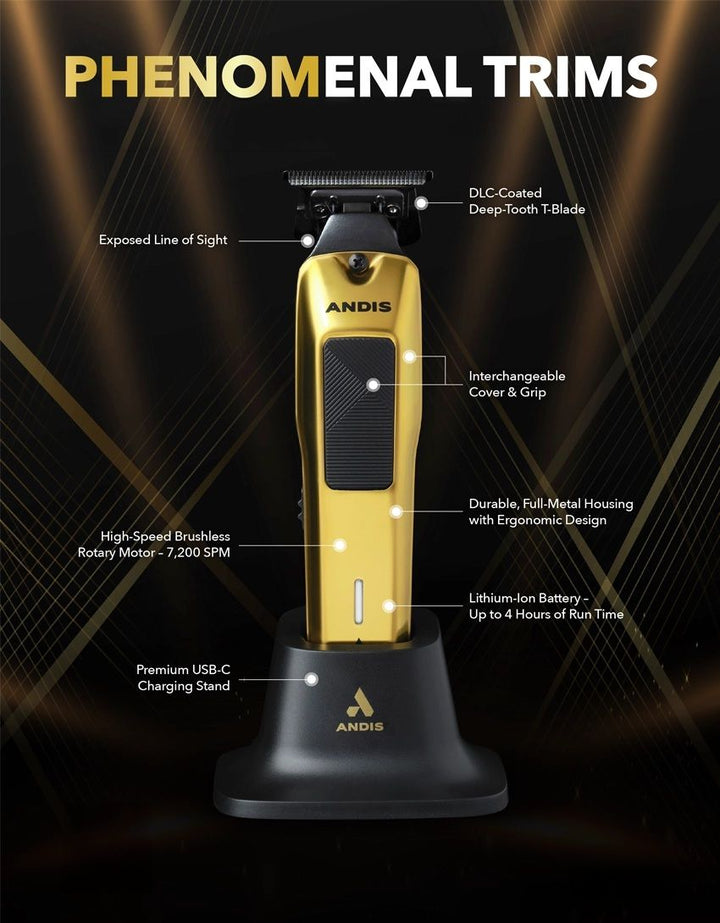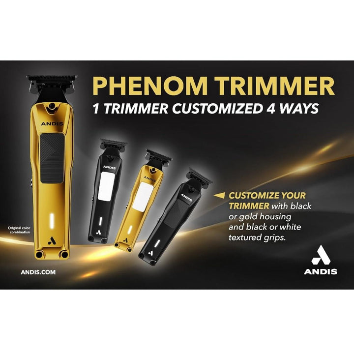 The Phenom Trimmer lives up to its namesake with every cut you make. Featuring a new brushless motor, it delivers high-speed power for precision work at 7,200 SPM. Express true personalization with special interchangeable all-metal cover and grip colorways for four color combinations. Deliver phenomenal trims with the DLC deep-tooth T-blade, and enjoy ultimate cut length versatility when paired with included attachment combs. Charge up effortlessly with the universal USB-C charging adapter or easy-release premium stand whenever, wherever.
