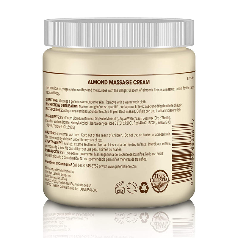 Created for professional use in spas and salons, Queen Helene Professional Almond Massage Cream tantalizes the senses with its sweet almond scent and luxurious, silky texture. As you massage the cream onto your skin, a blend of mineral oil, paraffin and beeswax quenches dry skin with nourishing relaxation Our fragrant massage cream is formulated to use on the body, neck and face, and any excess wipes away easily with a warm damp washcloth. Queen Helene is proud that our products are not tested on animals. Includes one 15 oz. jar of Queen Helene Professional Almond Massage Cream. Queen Helene brand has been a leader in quality and beauty products for professional and personal use since 1930. We are proud to have created a full line of affordable and effective body care products that are still passed on from generation to generation.