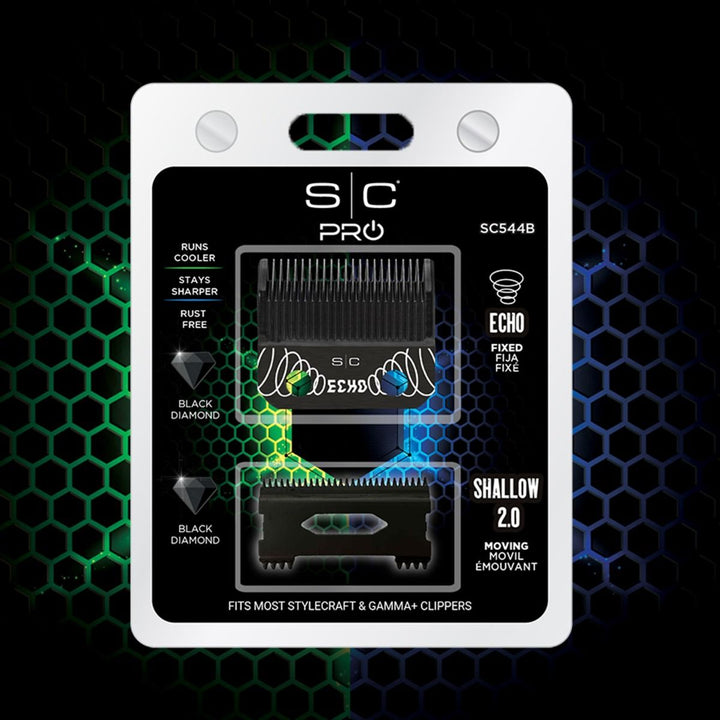 Stylecraft Replacement Echo Faper Fixed Black Diamond Carbon DLC Hair Clipper Blade with Shallow Tooth 2.0 Moving Cutter Set