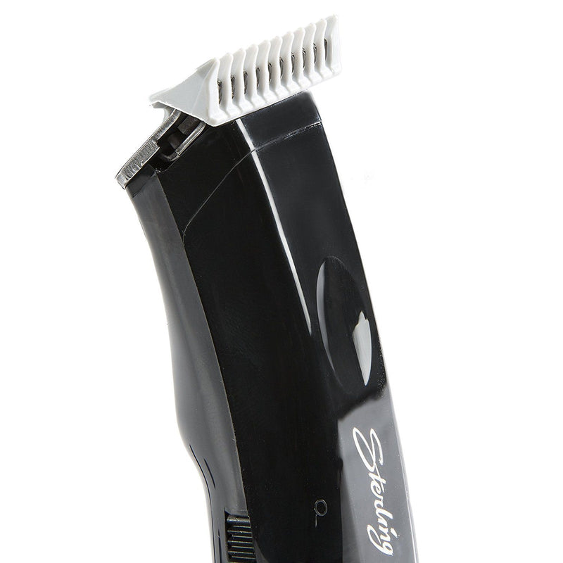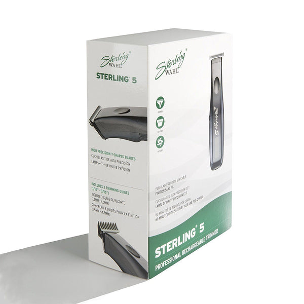 The Sterling 5 Trimmer offers you a free range of movement without worrying about cords. You get 60 minutes of uninterrupted work per charge of the battery. The high precision T-Blade is ideal for trimming and outlining and includes trimming guides for the perfect length every time. The Sterling 5 trimmer includes 3 trimming guides (1/16” – 3/16”), oil, cleaning brush, operating instructions, and red blade guard, all of which are designed for professional quality. Wahl Professional Sterling 5 Trimmer #8777 measures 5.5 inches in length and weighs 4.1 ounces. Features a Rotary Motor, NiMH Battery with a 60-minute run time, and T-Blade. Made in the U.S.A!
